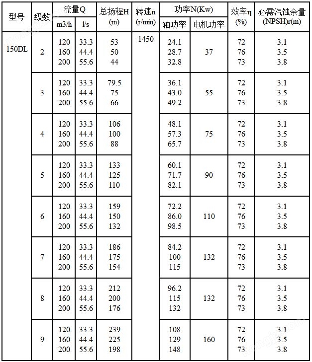 DL多級泵性能參數(shù)表: