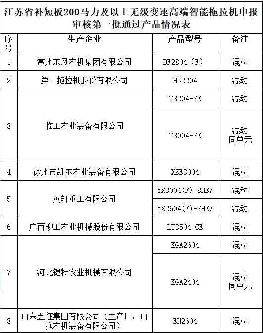 附件:江蘇省補短板200馬力及以上無級變速高端智能拖拉機申報審核第一批通過產(chǎn)品情況表