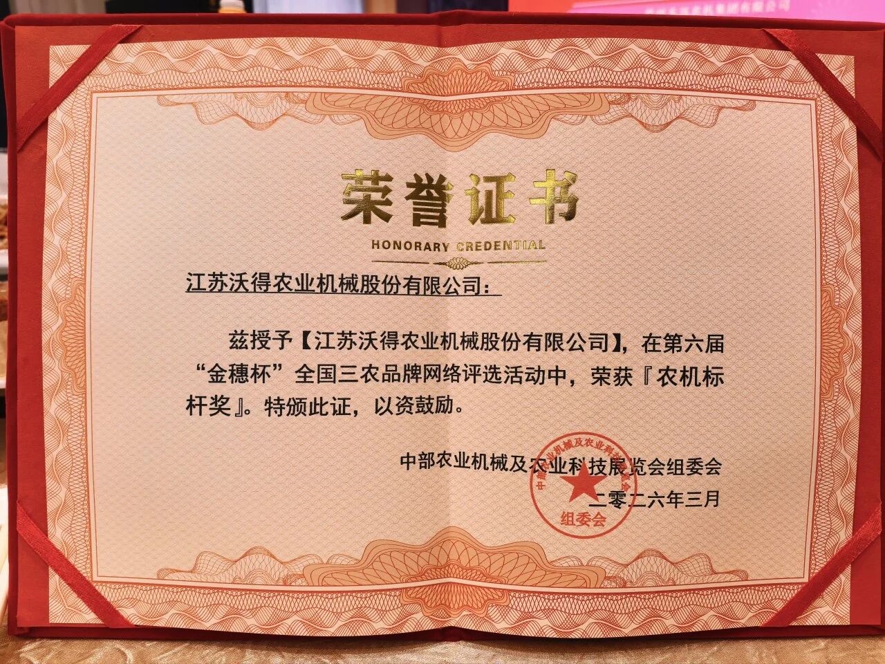 展會(huì)期間,作為重磅活動(dòng)之一的第六屆“金穗杯”全國(guó)三農(nóng)品牌網(wǎng)絡(luò)評(píng)選活動(dòng)頒獎(jiǎng)儀式同步舉行。沃得農(nóng)機(jī)憑借卓越的產(chǎn)品實(shí)力與廣泛的市場(chǎng)認(rèn)可,從眾多參選品牌中脫穎而出,榮膺“農(nóng)機(jī)標(biāo)桿獎(jiǎng)”。