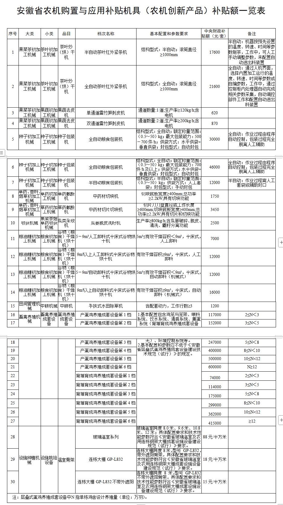 為加快推進農(nóng)機裝備補短板,加強新型農(nóng)機裝備推廣應用,推動設(shè)施農(nóng)業(yè)高質(zhì)量發(fā)展,近日,安徽省農(nóng)業(yè)農(nóng)村廳、安徽省財政廳聯(lián)合印發(fā)了《安徽省農(nóng)機創(chuàng)新產(chǎn)品補貼工作方案》,在全省范圍內(nèi)將茶葉紅外緊條機、糧食包裝機、雷竹筍剝皮機、中藥材切片切塊機、瓜蔞脫皮洗籽機、平床式糧食干燥機、手扶式水田除草機等7款專項鑒定產(chǎn)品,及連棟溫室、畜禽層疊式養(yǎng)殖設(shè)備等2款成套設(shè)備納入農(nóng)機創(chuàng)新產(chǎn)品補貼范圍。其中,專項鑒定產(chǎn)品按照常規(guī)機具補貼程序?qū)嵤?;層疊式蛋雞養(yǎng)殖、玻璃溫室及農(nóng)用連棟鋼架大棚成套設(shè)備按照本方案實施。